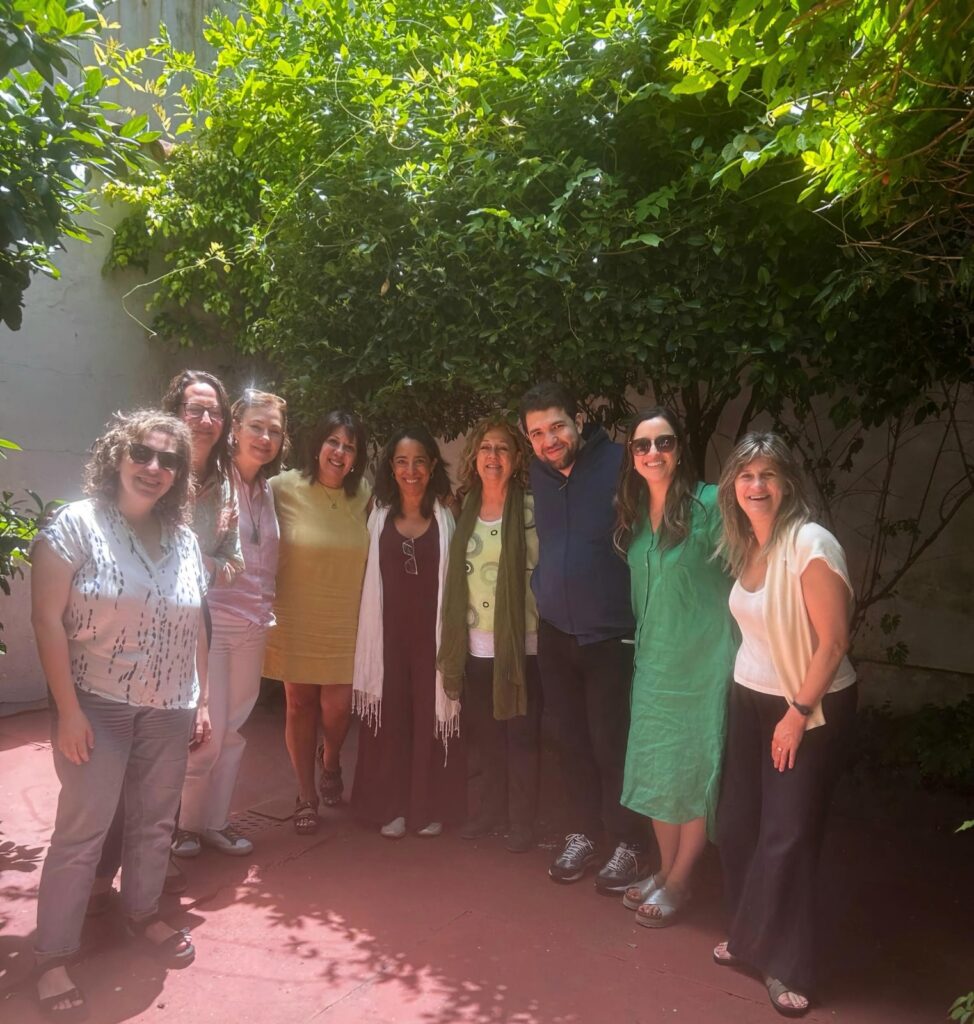 Andrina Ongay y Gabriela Pollak (Psicoanalistas APU) – Carmen Rodríguez (Psicóloga social y Dra. en Educación, muy vinculada a temas psicoanalíticos, nuestra coordinadora durante 2023 y 2024), y a mi lado, Eliana Pena, Bettiana Martello y Leonor Oncina (Psicoanalistas de APU)